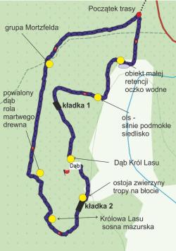 Opis trasy: Rezerwat Pupy leży przy drodze krajowej, jednej z głównych tras prowadzących na Mazury (trasa Warszawa - Mrągowo, Kętrzyn). Przy niej znajduje się parking leśny oraz drogowskaz kierujący na ścieżkę. Zwiedzanie ścieżki może stanowić ciekawy "przerywnik" podczas dłuższej podróży samochodem. Przejście zajmuje jedynie godzinę czasu. Główną atrakcją trasy jest to, że prowadzi ona wąskimi ścieżkami wnętrzem lasu. Po pokonaniu początkowego fragmentu przejścia przez las wyjeżdżoną drogą wychodzimy na skraj łąki, gdzie znajduje się oczko wodne stworzone w ramach odtwarzania siedlisk wilgotnych. Wokół widać ślady bytowania bobrów. Za łąką wchodzimy do podmokłego fragmentu lasu, gdzie poznajemy ols oraz rośliny typowe dla tego siedliska. Po przejściu krótkiej, 20 metrowej kładki, która umożliwia dalszy spacer, czeka nas fragment biegnący przez wnętrze mrocznego świerkowego lasu, w którym mijamy co chwilę monumentalne 270-letnie dęby- pomniki przyrody. Jeden z pomników, wypróchniały w środku, tworzy swojego rodzaju domek do którego schować się może nawet kilkoro dzieci. Obok niego znajduje się tablica "Dąb-Król Lasu", która dodatkowo kieruje do pobliskiego dębu- najgrubszego w całym Rezerwacie. Oprócz dębów mijamy po trasie wiele innych pomników przyrody min. wiekowe sosny i olbrzymie świerki. Dalej przechodzimy znów fragment silnie podmokłego olsu, gdzie obserwujemy ślady bytowania zwierząt- odciski kopyt na błocie. Kładka o długości 54 m umożliwia przejście tego fragmentu suchą nogą oraz jednocześnie, ograniczenie ingerencji ruchu pieszego w delikatną strukturę podmokłej gleby i poszycia. W tym miejscu możemy nauczyć się rozpoznawać tropy zwierząt, których wzory umieszczone są na tablicy. Dalej przechodząc przez kładkę nad pniem powalonego świerka dochodzimy do fragmentu trasy, którego główną atrakcją są ogromne strzeliste sosny. Przy jednej z nich stoi tablica "Sosna mazurska- Królowa lasu". Następnym ciekawym punktem jest powalony 250-letni dąb, nad którym zbudowano schodki i kładkę umożliwiające przejście. Przejściu towarzyszy tablica "Drugie życie drzewa". Po wyjściu na linię oddziałową czeka na nas ostatnia atrakcja: zachowana grupa Mortzfelda- krąg buków, który jest pozostałością gospodarki leśnej prowadzonej tutaj w czasach przedwojennych.